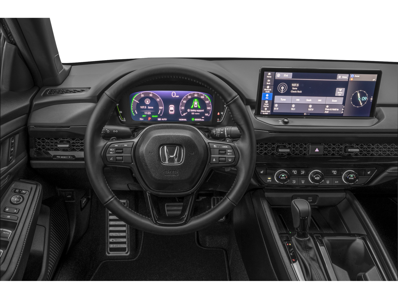 The Honda Accord Hybrid offers Apple CarPlay for seamless connectivity. This mid-size car keeps you comfortable with Auto Climate. Bluetooth® technology is built into this Honda Accord Hybrid, keeping your hands on the steering wheel and your focus on the road. Start the vehicle from inside with remote start. The leather seats in this mid-size car are a must for buyers looking for comfort, durability, and style. The vehicle comes equipped with Android Auto for seamless smartphone integration on the road. See what's behind you with the back up camera on it. This unit has automated speed control that adjusts to maintain a safe following distance, enhancing highway driving convenience. This model's Forward Collision Warning feature alerts drivers to potential front-end collisions. This mid-size car has an elegant black exterior finish. This unit has a 4 Cyl, 2.0L high output engine. Set the temperature exactly where you are most comfortable in this 2026 Honda Accord Hybrid . The fan speed and temperature will automatically adjust to maintain your preferred zone climate.