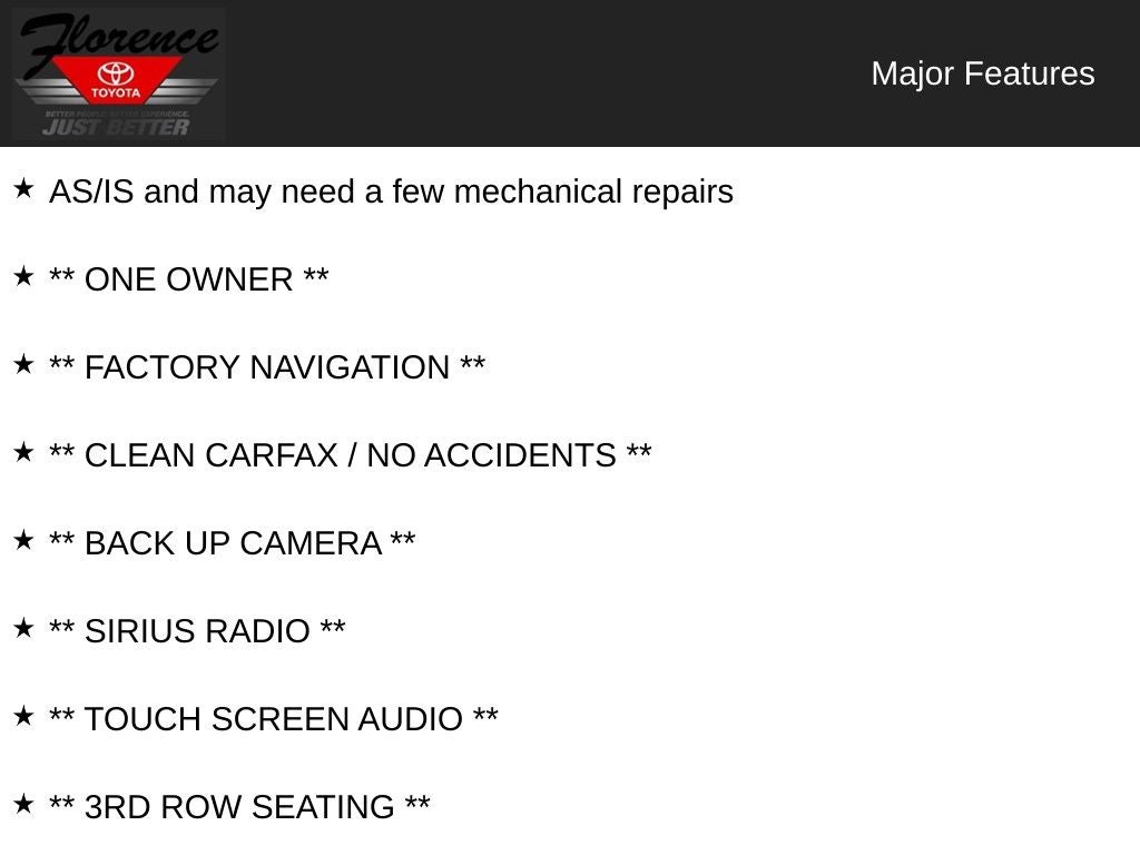 At Florence Toyota come see how our USED CARS are JUST BETTER . We offer the following benefits: Lifetime Power Train (Some exclusions apply), 1st Year Maintenance, $500 Additional Trade In Appraisal, 72 Hour Vehicle Exchange Program, Yearly Vehicle Appraisal & Safety Inspection, VIP Loyalty Program, Routine Express Service, Courtesy Service Shuttle, Express Buying Service. Also, as an added benefit we will buy your vehicle even if you don't buy ours!! Call today (866)830-0793or visit us at www.florencetoyota.com *Customer must trade-in a vehicle to receive $1,000 Trade Assist credit that is included in the online price. **Financing must be provided by a third-party lender using this dealership’s assistance for Customer to receive $1,000 Financing Assist credit that is included in the online price. See dealer for complete details.