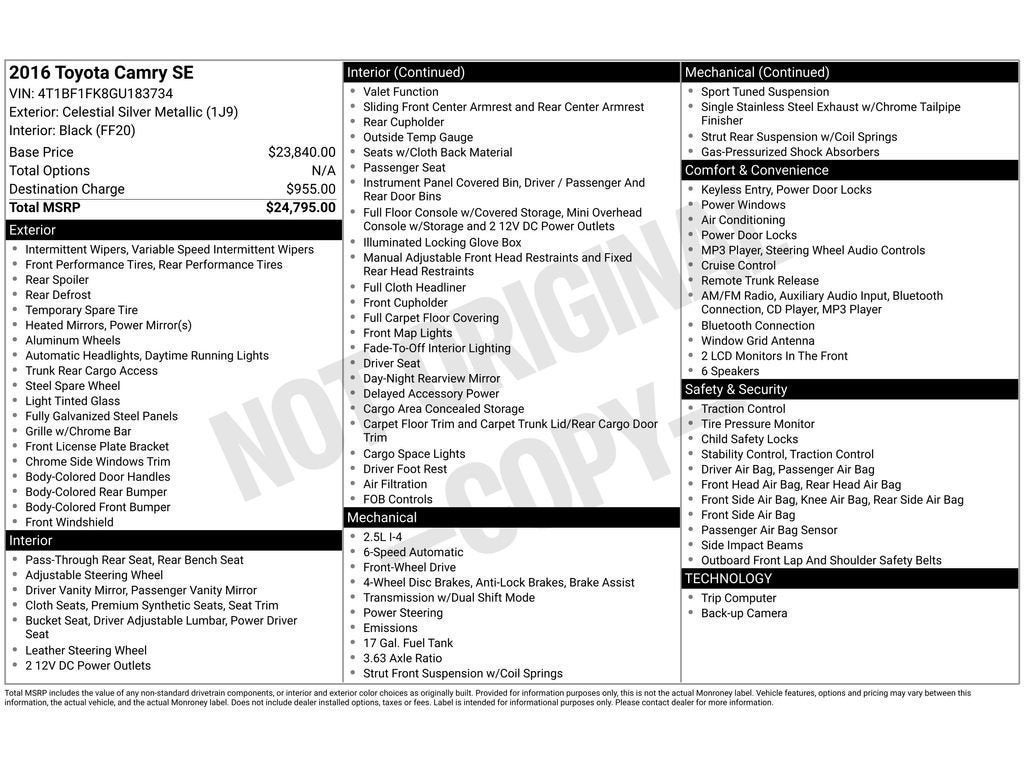 Just the right size to accommodate all your needs. It has room for passengers and plenty of trunk space. The leather seats in the vehicle are a must for buyers looking for comfort, durability, and style. With the adjustable lumbar support in this mid-size car your back will love you. Bluetooth® technology is built into this Toyota Camry, keeping your hands on the steering wheel and your focus on the road. See what's behind you with the back up camera on this 2016 Toyota Camry . Maintaining a stable interior temperature in this model is easy with the climate control system. Easily set your speed in the vehicle with a state of the art cruise control system. Increase or decrease velocity with the touch of a button.