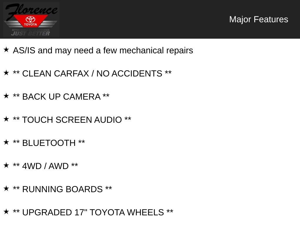 At Florence Toyota come see how our USED CARS are JUST BETTER . We offer the following benefits: Lifetime Power Train (Some exclusions apply), 1st Year Maintenance, $500 Additional Trade In Appraisal, 72 Hour Vehicle Exchange Program, Yearly Vehicle Appraisal & Safety Inspection, VIP Loyalty Program, Routine Express Service, Courtesy Service Shuttle, Express Buying Service. Also, as an added benefit we will buy your vehicle even if you don't buy ours!! Call today (866)830-0793or visit us at www.florencetoyota.com *Customer must trade-in a vehicle to receive $1,000 Trade Assist credit that is included in the online price. **Financing must be provided by a third-party lender using this dealership’s assistance for Customer to receive $1,000 Financing Assist credit that is included in the online price. See dealer for complete details.