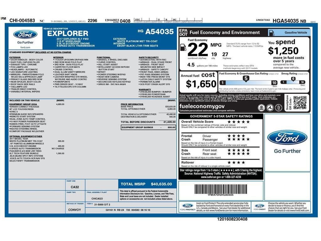 Equipment Group 202A: 3.39 Non-Limited-slip Axle Ratio; Dual-Zone Electronic Automatic Temperature Control; Forward Sensing System; 6160 lbs GVWR; 18" Painted Aluminum Wheels; Premium Audio System; Remote Start System; Hands-Free Foot-Activated Liftgate; Heated Steering Wheel Comfort Package: Leather Heated Bucket Seats XLT Technology Feature Bundle: Voice-Activated Touchscreen Navigation System; BLIS (Blind Spot Information System); Auto-Dimming Driver's Sideview Mirror Driver Connect Package: SYNC Communication and Entertainment System; 2 Driver Configurable 4.2" Color LCD Displays; Auto-Dimming Rearview Mirror **Equipment listed is based on original vehicle build and subject to change. Please confirm the accuracy of the included equipment by calling the dealer prior to purchase.**