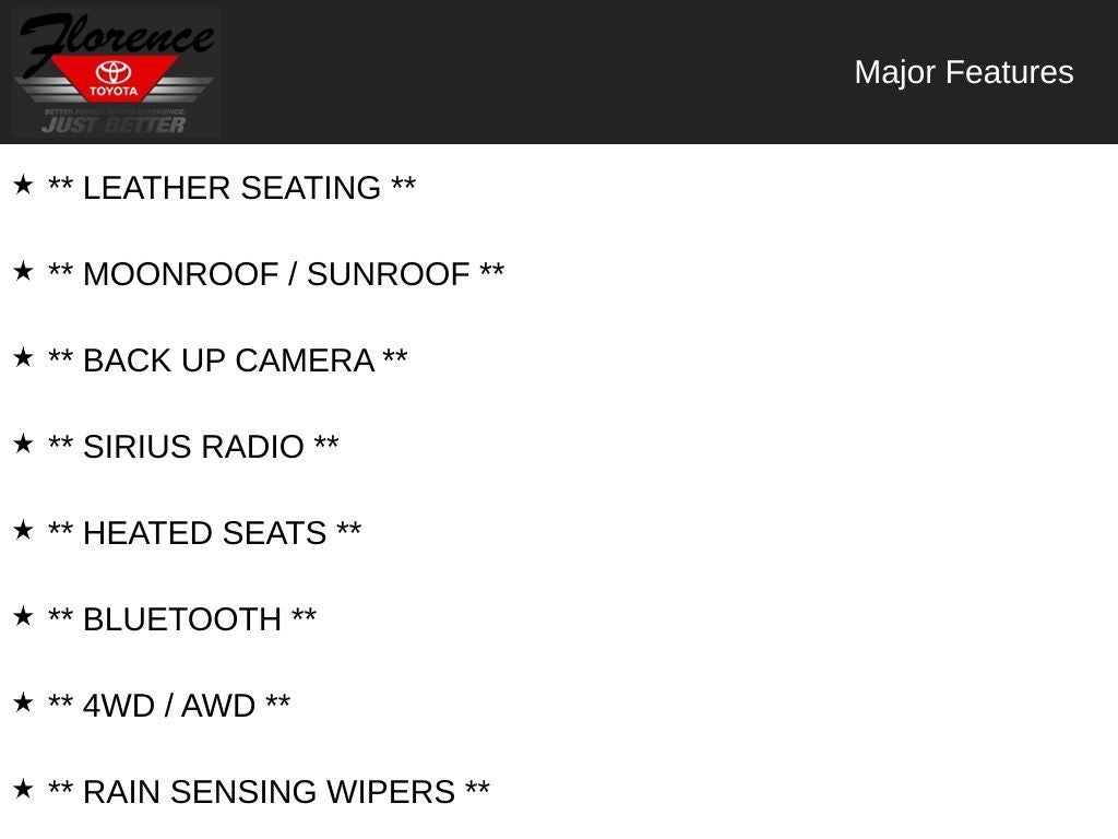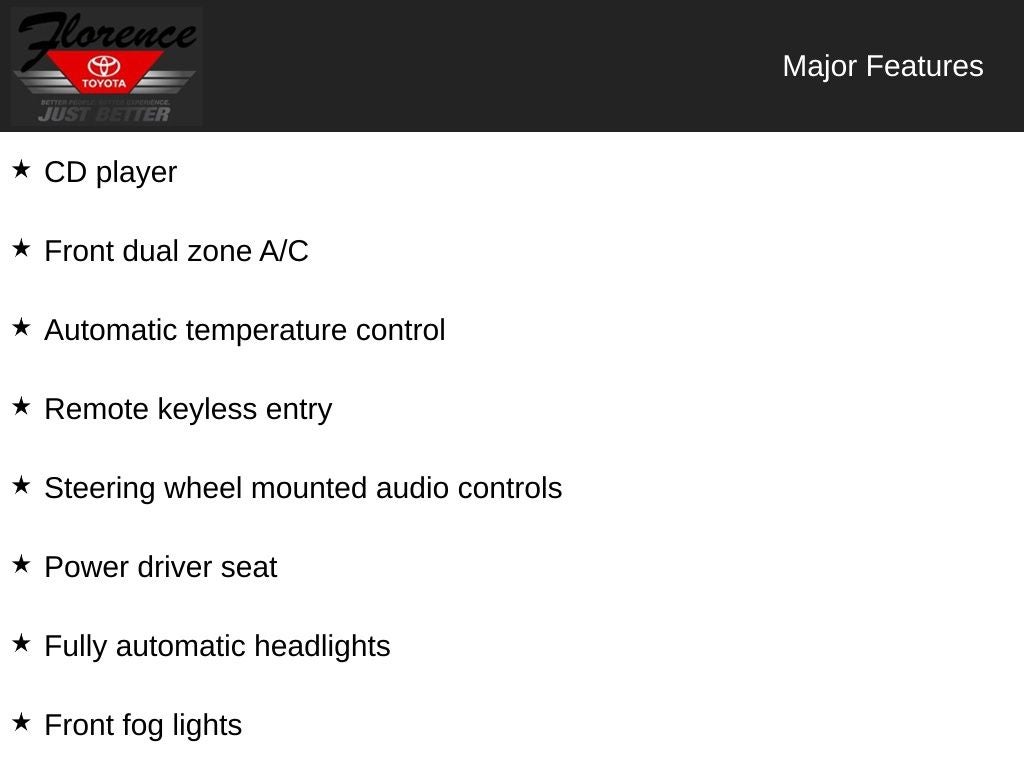 At Florence Toyota come see how our USED CARS are JUST BETTER. We offer the following benefits: Lifetime Power Train (Some exclusions apply), 1st Year Maintenance, $500 Additional Trade In Appraisal, 72 Hour Vehicle Exchange Program, Yearly Vehicle Appraisal & Safety Inspection, VIP Loyalty Program, Routine Express Service, Courtesy Service Shuttle, Express Buying Service. Also, as an added benefit we will buy your vehicle even if you don't buy ours!! Call today (866)830-0793 or visit us at www.florencetoyota.com *Customer must trade-in a vehicle to receive $1,000 Trade Assist credit that is included in the online price. **Financing must be provided by a third-party lender using this dealership's assistance for Customer to receive $1,000 Financing Assist credit that is included in the online price. See dealer for complete details.