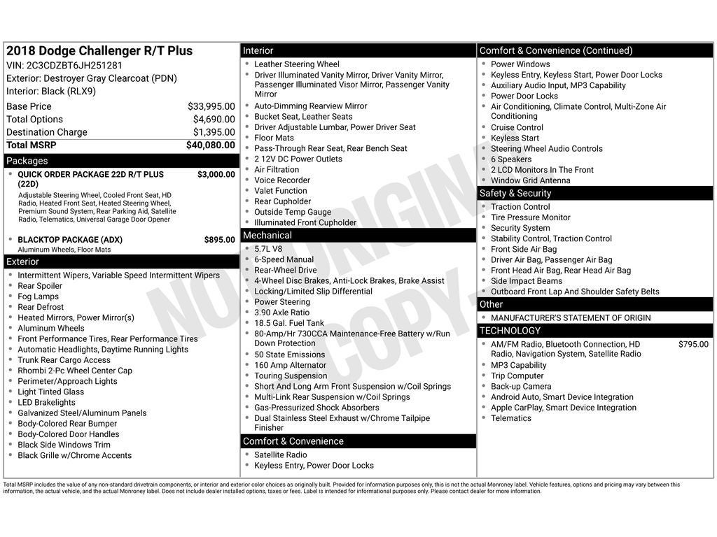 Blacktop Package: Black Fuel Filler Door; Gloss Black Instrument Panel Cluster Trim Rings; Rear Black Spoiler; HEMI Blacktop Fender Badge; Blacktop R/T Badge; 20" X 8.0" Gloss Black Painted Aluminum Wheels; Black-Edged Premium Floormats; Black Grille with Bezel; Challenger Blacktop Grille Badge. Quick Order Package 22D R/T Plus: 1-Year SiriusXM Radio Service; 276 Watt Amplifier; Integrated Center Stack Radio; For Details. Visit DriveUconnect.com; Heated Front Seats; For More Info. Call 800-643-2112; Bright Pedals; Shark Fin Antenna; Leather Trim Seats; Door Trim Panel with Ambient Lighting; Media Hub (2 USB. Aux); Heated Steering Wheel; 8.4" Touchscreen Display; Power Tilt/telescope Steering Column; SiriusXM Satellite Radio; HD Radio; Hectic Mesh Interior Accents; 1-Year SiriusXM Guardian Trial; Ventilated Front Seats; Universal Garage Door Opener; 6 Premium Speakers; ParkSense Rear Park Assist System; Nappa Leather Sport Seat; Rhombi 2 Piece Wheel Center Cap. Uconnect 4C Navigation Radio with 8.4" Display. **Equipment listed is based on original vehicle build and subject to change. Please confirm the accuracy of the included equipment by calling the dealer prior to purchase.**