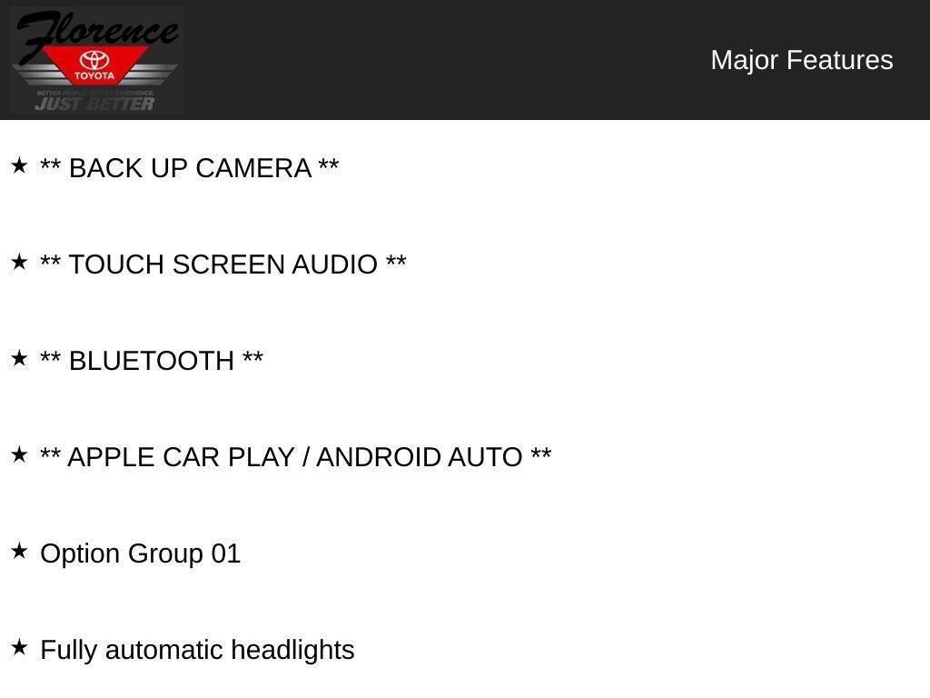 - Radio: AM/FM Audio System -inc: 7" LCD touchscreen display (low cost display audio), 6 speakers, Android Auto, Apple CarPlay, Siri and Google Now support, dual front USB outlets (1x data/charge, 1x charge only) and aux input jack