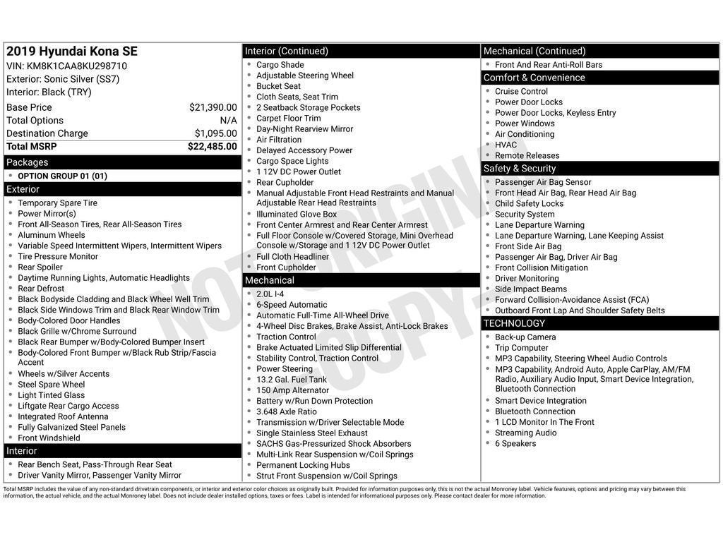 Looking for a reliable compact SUV in Florence SC? Check out this 2019 Hyundai Kona SE with 4WD and a fuel-efficient 4-cylinder 2.0L gasoline engine. This Hyundai Kona SE delivers confident handling and traction in rain or light snow, making it a great choice for Carolina seasonal driving. Whether you commute or explore nearby beaches and mountain trips, the Hyundai Kona's nimble size and efficient performance make it versatile and fun to drive. This Hyundai Kona SE comes equipped with modern tech features drivers want: Apple CarPlay and Android Auto for seamless smartphone integration, Hands-Free Bluetooth® for safer calls on the go, and a Back-Up Camera to simplify parking in tight spots. Lane Keep Assist adds an extra level of safety and helps reduce driver fatigue on longer drives. Priced to move and advertised as the best price in the Florence SC area, this pre-owned 2019 Hyundai Kona SE offers strong value for buyers seeking quality and features without the new-car price tag. Clean interior, solid service history, and ready for immediate test drives. Don't miss this opportunity to own a capable, tech-forward compact SUV with 4WD. Contact us in Florence SC to schedule your test drive and secure this great-priced Hyundai Kona before it's gone.
