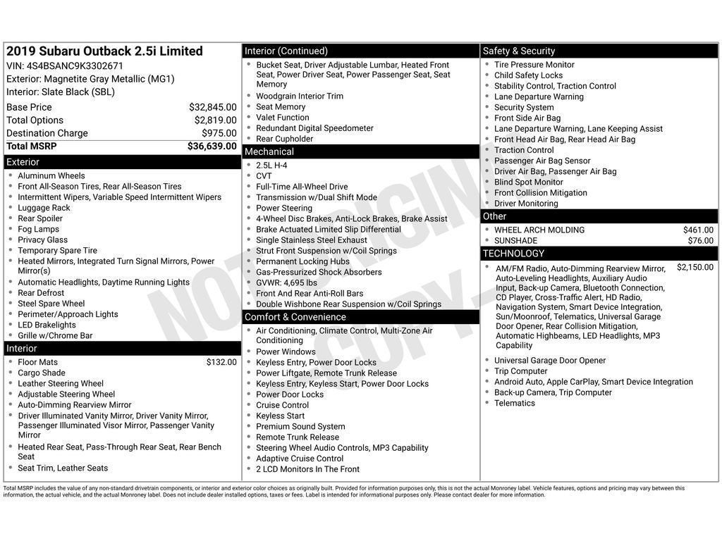 Lane Keep Assist in this unit helps maintain safe driving by gently steering to stay within the lane. This 2019 Subaru Outback offers Automatic Climate Control for personalized comfort. This model has auto-adjust speed for safe following. This Subaru Outback offers Apple CarPlay for seamless connectivity. The leather seats in this unit are a must for buyers looking for comfort, durability, and style. Bluetooth® technology is built into this mid-size suv, keeping your hands on the steering wheel and your focus on the road. The installed navigation system will keep you on the right path. See what's behind you with the back up camera on it. This Subaru Outback is equipped with the latest generation of XM/Sirius Radio. The vehicle has a clean CARFAX vehicle history report. This vehicle comes equipped with Android Auto for seamless smartphone integration on the road. Set the temperature exactly where you are most comfortable in this vehicle. The fan speed and temperature will automatically adjust to maintain your preferred zone climate.