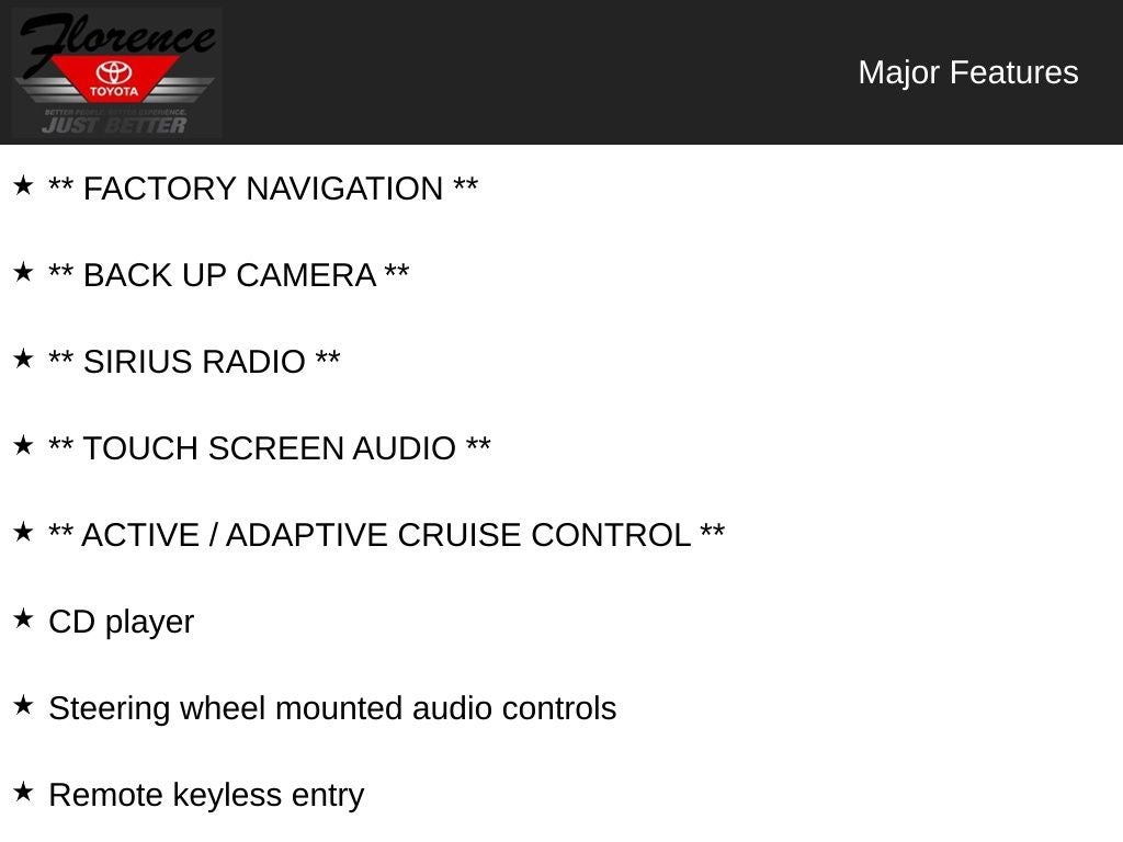 At Florence Toyota, come see how our USED CARS are JUST BETTER. We offer the following benefits: Lifetime Power Train (Some exclusions apply), 1st Year Maintenance, $500 Additional Trade In Appraisal, 72 Hour Vehicle Exchange Program, Yearly Vehicle Appraisal & Safety Inspection, VIP Loyalty Program, Routine Express Service, Courtesy Service Shuttle, Express Buying Service. Also, as an added benefit we will buy your vehicle even if you don't buy ours!! Call today (866)830-0793 or visit us at www.florencetoyota.com *Customer must trade-in a vehicle to receive $1,000 Trade Assist credit that is included in the online price. **Financing must be provided by a third-party lender using this dealership's assistance for Customer to receive $1,000 Financing Assist credit that is included in the online price. See dealer for complete details.