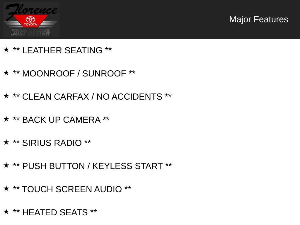 At Florence Toyota come see how our USED CARS are JUST BETTER . We offer the following benefits: Lifetime Power Train (Some exclusions apply), 1st Year Maintenance, $500 Additional Trade In Appraisal, 72 Hour Vehicle Exchange Program, Yearly Vehicle Appraisal & Safety Inspection, VIP Loyalty Program, Routine Express Service, Courtesy Service Shuttle, Express Buying Service. Also, as an added benefit we will buy your vehicle even if you don't buy ours!! Call today (866)830-0793 or visit us at www.florencetoyota.com *Customer must trade-in a vehicle to receive $1,000 Trade Assist credit that is included in the online price. **Financing must be provided by a third-party lender using this dealership's assistance for Customer to receive $1,000 Financing Assist credit that is included in the online price. See dealer for complete details.