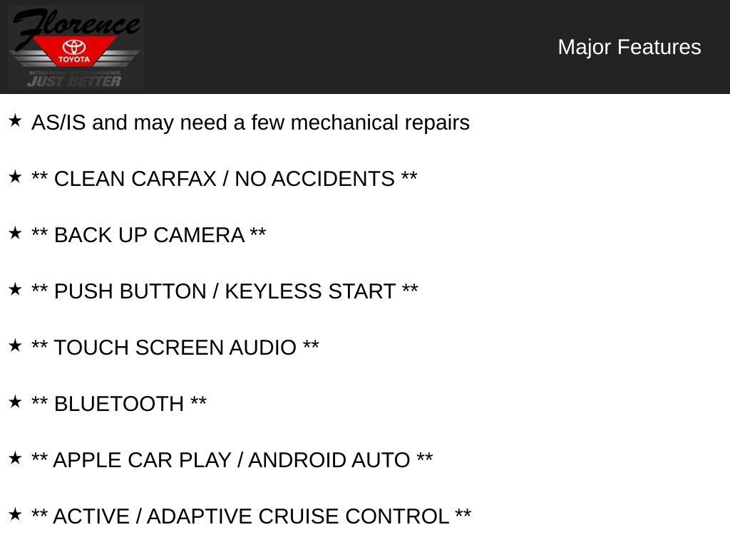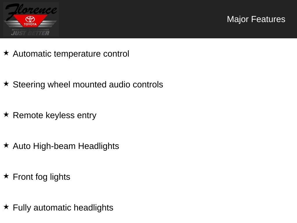 At Florence Toyota come see how our USED CARS are JUST BETTER . We offer the following benefits: Lifetime Power Train (Some exclusions apply), 1st Year Maintenance, $500 Additional Trade In Appraisal, 72 Hour Vehicle Exchange Program, Yearly Vehicle Appraisal & Safety Inspection, VIP Loyalty Program, Routine Express Service, Courtesy Service Shuttle, Express Buying Service. Also, as an added benefit we will buy your vehicle even if you don't buy ours!! Call today (866)830-0793or visit us at www.florencetoyota.com *Customer must trade-in a vehicle to receive $1,000 Trade Assist credit that is included in the online price. **Financing must be provided by a third-party lender using this dealership’s assistance for Customer to receive $1,000 Financing Assist credit that is included in the online price. See dealer for complete details.