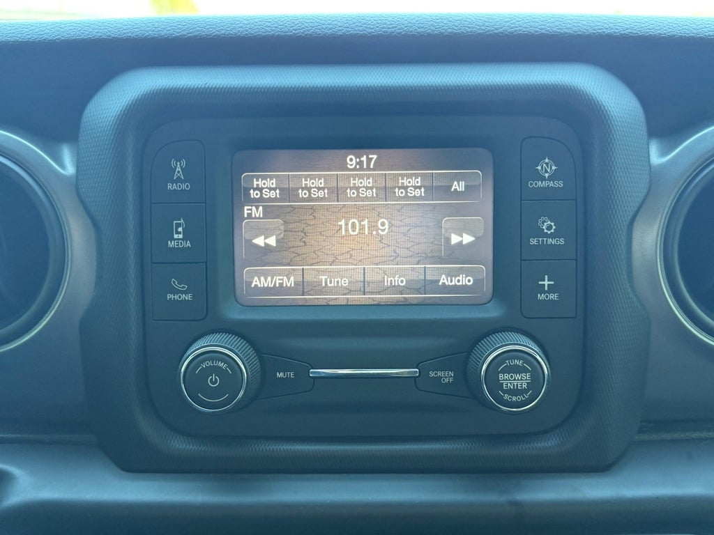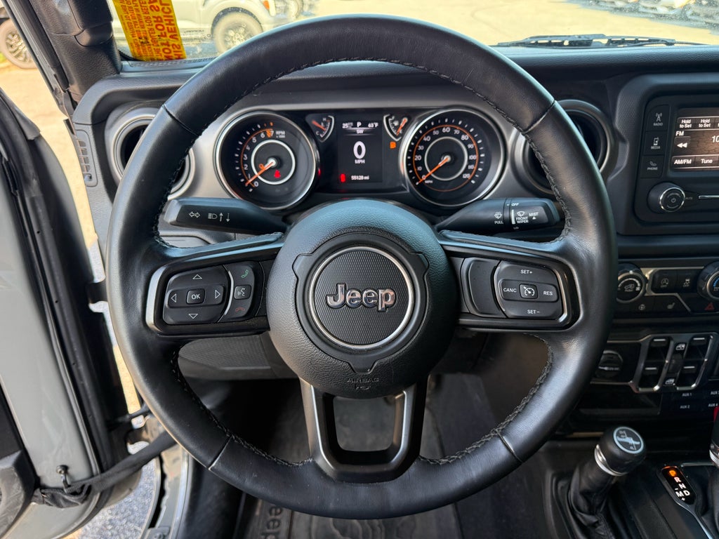 Cold Weather Group: Remote Start System; Heated Front Seats; Heated Steering Wheel. Convenience Group: Remote Start System; Universal Garage Door Opener. Quick Order Package 24W Willys: Speed Sensitive Power Locks; Protection Sill Rails; Leather Wrapped Steering Wheel; 4-Wheel Drive Decal; Black Grille; MOPAR All-Weather Floor Mats; LT255/75R17C OWL On/off Road Tires; 2-Piece Body Color Fender Flares; Front 1-Touch Down Power Windows; Anti-Spin Differential Rear Axle; Front Heavy Duty Red Accent Shock Absorbers; Security Alarm; Willys; Mold in Color Bumper with Gloss Black; Automatic Headlamps; 17" X 7.5" Black Aluminum Wheels with Gray Pad; Deep Tint Sunscreen Windows; Black Trail Rated Badge; Willys Hood Decal; Rear Heavy Duty Red Accent Shock Absorbers; 97 Mph Maximum Speed Calibration; Power Heated Mirrors; Daytime Running Lamp System; Power Tailgate Lock; Bridgestone Brand Tires; Remote Keyless Entry; Sun Visors with Illuminated Vanity Mirrors. Trailer Tow Package: Heavy Duty Engine Cooling; Trailer Hitch Zoom; Class IV Hitch Receiver; 240 Amp Alternator. Auxiliary Switch Group: 700 Amp Maintenance Free Battery; Auxiliary Switches; 240 Amp Alternator. Quick Order Package 23W Willys: Speed Sensitive Power Locks; Protection Sill Rails; Leather Wrapped Steering Wheel; 4-Wheel Drive Decal; Black Grille; MOPAR All-Weather Floor Mats; LT255/75R17C OWL On/off Road Tires; 2-Piece Body Color Fender Flares; Front 1-Touch Down Power Windows; Anti-Spin Differential Rear Axle; Front Heavy Duty Red Accent Shock Absorbers; Security Alarm; Willys; Mold in Color Bumper with Gloss Black; Automatic Headlamps; 17" X 7.5" Black Aluminum Wheels with Gray Pad; Deep Tint Sunscreen Windows; Black Trail Rated Badge; Willys Hood Decal; Rear Heavy Duty Red Accent Shock Absorbers; 97 Mph Maximum Speed Calibration; Power Heated Mirrors; Daytime Running Lamp System; Power Tailgate Lock; Bridgestone Brand Tires; Remote Keyless Entry; Sun Visors with Illuminated Vanity Mirrors. Black 3-Piece Hard Top. Sting-Gray Clearcoat. Corning Gorilla Glass. MOPAR Grab Handle Kit. **Equipment listed is based on original vehicle build and subject to change. Please confirm the accuracy of the included equipment by calling the dealer prior to purchase.**
