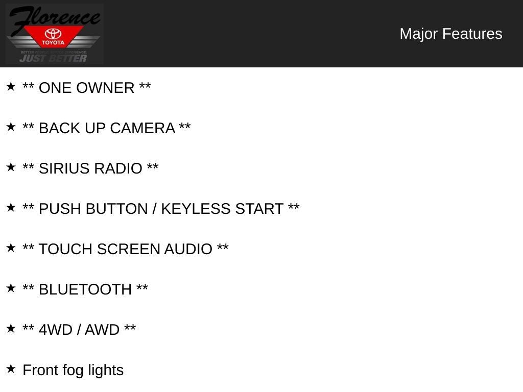 At Florence Toyota, we are committed to providing our customers with the highest level of service and the finest pre-owned vehicles. Come see how our USED CARS are JUST BETTER. We offer the following benefits: Lifetime Power Train (Some exclusions apply), 1st Year Maintenance, $500 Additional Trade In Appraisal, 72 Hour Vehicle Exchange Program, Yearly Vehicle Appraisal & Safety Inspection, VIP Loyalty Program, Routine Express Service, Courtesy Service Shuttle, Express Buying Service. Also, as an added benefit we will buy your vehicle even if you don't buy ours!! Call today (866)830-0793 or visit us at www.florencetoyota.com *Customer must trade-in a vehicle to receive $1,000 Trade Assist credit that is included in the online price. **Financing must be provided by a third-party lender using this dealership's assistance for Customer to receive $1,000 Financing Assist credit that is included in the online price. See dealer for complete details.