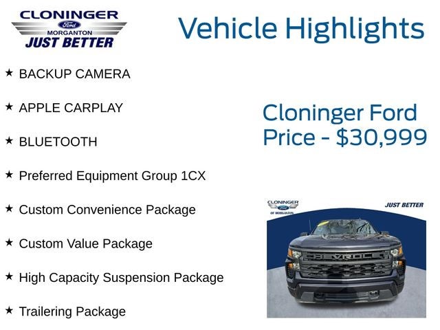 Custom Convenience Package (Electric Rear-Window Defogger, EZ Lift Power Lock & Release Tailgate, LED Cargo Area Lighting, and Remote Vehicle Starter System), Custom Value Package, High Capacity Suspension Package, Preferred Equipment Group 1CX (10-Way Power Driver Seat w/Lumbar, 120-Volt Instrument Panel Power Outlet, 3.5 Monochromatic Display Driver Info Center, Bluetooth® For Phone, Color-Keyed Carpeting Floor Covering, Compass, Deep-Tinted Glass, Dual Rear USB Ports (Charge Only), Electrical Steering Column Lock, Electronic Cruise Control, Front Frame-Mounted Black Recovery Hooks, Front Rubberized Vinyl Floor Mats, HD Rear Vision Camera, Manual Tilt Wheel Steering Column, OnStar & Chevrolet Connected Services Capable, Power Front Windows w/Driver Express Up/Down, Power Front Windows w/Passenger Express Down, Power Rear Windows w/Express Down, Rear 60/40 Folding Bench Seat (Folds Up), Rear Rubberized-Vinyl Floor Mats, Remote Keyless Entry, SiriusXM Radio, Standard Tailgate, Theft Deterrent System (Unauthorized Entry), Wireless Phone Projection, 120-Volt Bed Mounted Power Outlet, Chevrolet Connected Access Capable, and Wi-Fi Hot Spot Capable), Trailering Package (Hitch Guidance), 8-Speed Automatic, 4WD, Black Cloth, 3.42 Rear Axle Ratio, 4-Wheel Disc Brakes, 40/20/40 Front Split-Bench Seat, 6 Speakers, 6-Speaker Audio System, ABS brakes, Air Conditioning, Alloy wheels, AM/FM radio: SiriusXM, Apple CarPlay/Android Auto, Auto High-beam Headlights, Automatic Emergency Braking, Black Chrome Exhaust Tip (LPO), Brake assist, Bumpers: body-color, Cloth Seat Trim, Del