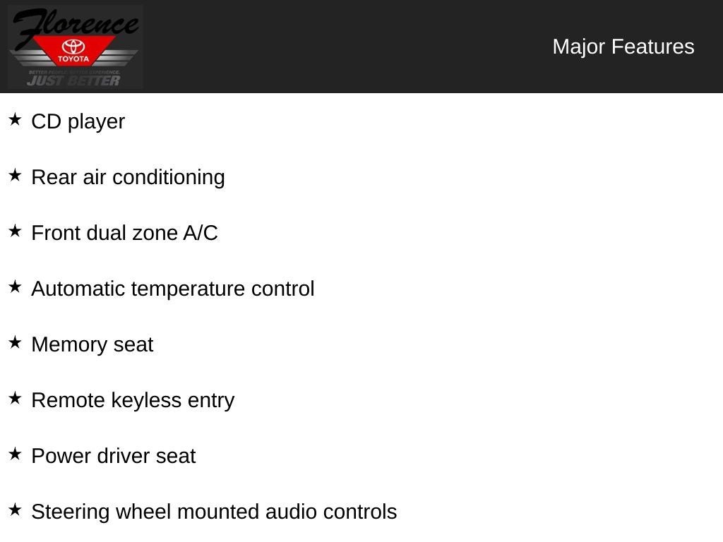 At Florence Toyota come see how our USED CARS are JUST BETTER . We offer the following benefits: Lifetime Power Train (Some exclusions apply), 1st Year Maintenance, $500 Additional Trade In Appraisal, 72 Hour Vehicle Exchange Program, Yearly Vehicle Appraisal & Safety Inspection, VIP Loyalty Program, Routine Express Service, Courtesy Service Shuttle, Express Buying Service. Also, as an added benefit we will buy your vehicle even if you don't buy ours!! Call today (866)830-0793 or visit us at www.florencetoyota.com *Customer must trade-in a vehicle to receive $1,000 Trade Assist credit that is included in the online price. **Financing must be provided by a third-party lender using this dealership's assistance for Customer to receive $1,000 Financing Assist credit that is included in the online price. See dealer for complete details.