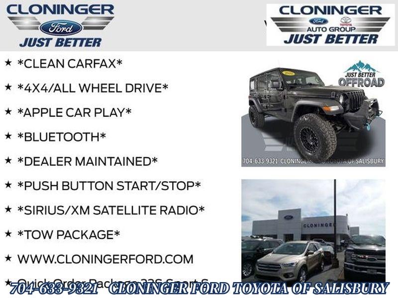 2022 Jeep Wrangler Unlimited Sport S — pristine condition with 0 miles, located in Salisbury, NC. This iconic 4-door Jeep delivers legendary off-road capability with 4WD and a powerful V6 3.6L gasoline engine, blending rugged performance with everyday comfort. With exceptionally low mileage and a CARFAX Clean Report, this Jeep Wrangler offers peace of mind and showroom-quality condition at the best price in the area. Equipped for modern connectivity and convenience, the Sport S includes Apple CarPlay and Android Auto for seamless smartphone integration, and XM Radio for endless entertainment on the road. Backup Camera enhances safety and parking confidence, while the Unlimited body provides spacious seating and cargo versatility for weekend adventures or daily driving. This Jeep Wrangler Unlimited Sport S stands out for value and capability: 4WD traction for trails and rough weather, a torquey V6 for towing and spirited driving, and a clean vehicle history report. Whether you're seeking a dependable off-roader, a stylish daily driver, or a weekend getaway vehicle, this Jeep combines utility and tech features at an unbeatable price. Located in Salisbury, NC, this zero-mile Jeep Wrangler represents a rare opportunity to own a like-new 2022 model with low mileage and full modern amenities. Contact us to schedule a viewing and lock in the best price on this exceptional Jeep Wrangler Unlimited Sport S today.