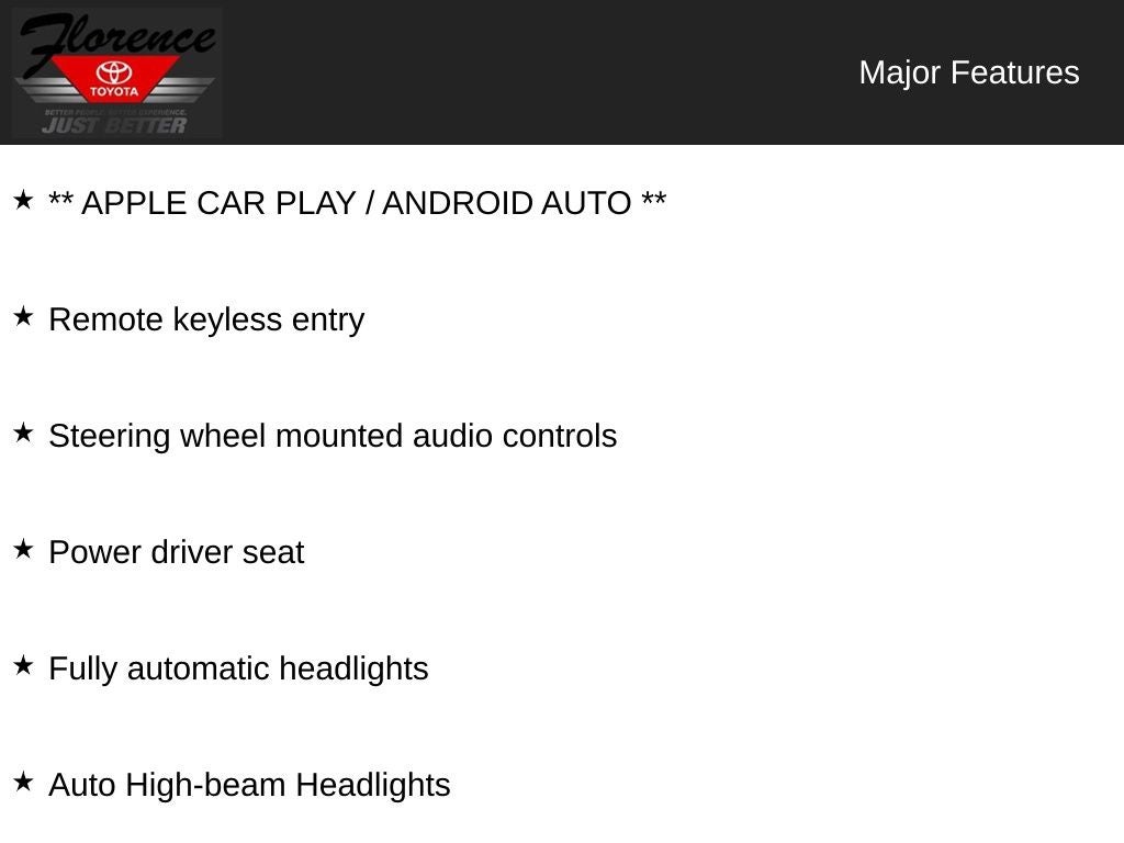 At Florence Toyota, come see how our USED CARS are JUST BETTER. We offer the following benefits: Lifetime Power Train (Some exclusions apply), 1st Year Maintenance, $500 Additional Trade In Appraisal, 72 Hour Vehicle Exchange Program, Yearly Vehicle Appraisal & Safety Inspection, VIP Loyalty Program, Routine Express Service, Courtesy Service Shuttle, Express Buying Service. Also, as an added benefit, we will buy your vehicle even if you don't buy ours!! Call today (866)830-0793 or visit us at www.florencetoyota.com *Customer must trade-in a vehicle to receive $1,000 Trade Assist credit that is included in the online price. **Financing must be provided by a third-party lender using this dealership's assistance for Customer to receive $1,000 Financing Assist credit that is included in the online price. See dealer for complete details.