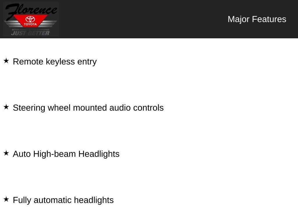 At Florence Toyota come see how our USED CARS are JUST BETTER. We offer the following benefits: Lifetime Power Train (Some exclusions apply), 1st Year Maintenance, $500 Additional Trade In Appraisal, 72 Hour Vehicle Exchange Program, Yearly Vehicle Appraisal & Safety Inspection, VIP Loyalty Program, Routine Express Service, Courtesy Service Shuttle, Express Buying Service. Also, as an added benefit we will buy your vehicle even if you don't buy ours!! Call today (866)830-0793 or visit us at www.florencetoyota.com *Customer must trade-in a vehicle to receive $1,000 Trade Assist credit that is included in the online price. **Financing must be provided by a third-party lender using this dealership's assistance for Customer to receive $1,000 Financing Assist credit that is included in the online price. See dealer for complete details.
