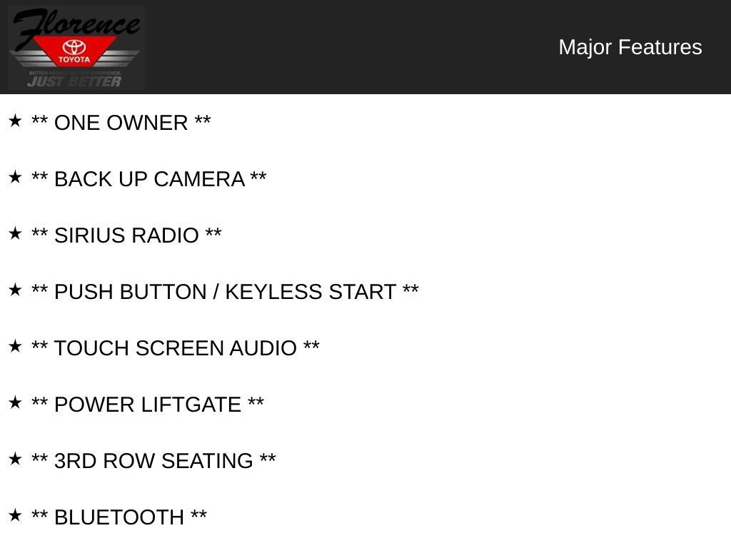 At Florence Toyota, come see how our USED CARS are JUST BETTER. We offer the following benefits: Lifetime Power Train (Some exclusions apply), 1st Year Maintenance, $500 Additional Trade In Appraisal, 72 Hour Vehicle Exchange Program, Yearly Vehicle Appraisal & Safety Inspection, VIP Loyalty Program, Routine Express Service, Courtesy Service Shuttle, Express Buying Service. Also, as an added benefit, we will buy your vehicle even if you don't buy ours!! Call today (866)830-0793 or visit us at www.florencetoyota.com *Customer must trade-in a vehicle to receive $1,000 Trade Assist credit that is included in the online price. **Financing must be provided by a third-party lender using this dealership's assistance for Customer to receive $1,000 Financing Assist credit that is included in the online price. See dealer for complete details.