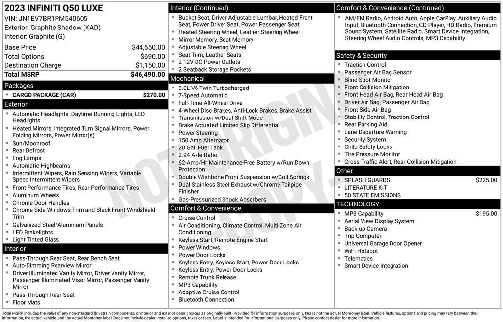 - Radio: INFINITI InTouch Dual HD Display System -inc: 16 speaker Bose Performance Series audio w/Bose Centerpoint simulated surround, wireless Apple CarPlay, Siri Eyes Free, Android Auto, Bluetooth® hands-free phone system w/text messaging assistant, voice recognition for audio, Bluetooth® and vehicle information, streaming audio via Bluetooth®, 2 illuminated USB connection ports (1 type A, 1 type C), auxiliary audio input, SiriusXM radio w/advanced audio features w/3-month complimentary trial and Wi-Fi hotspot