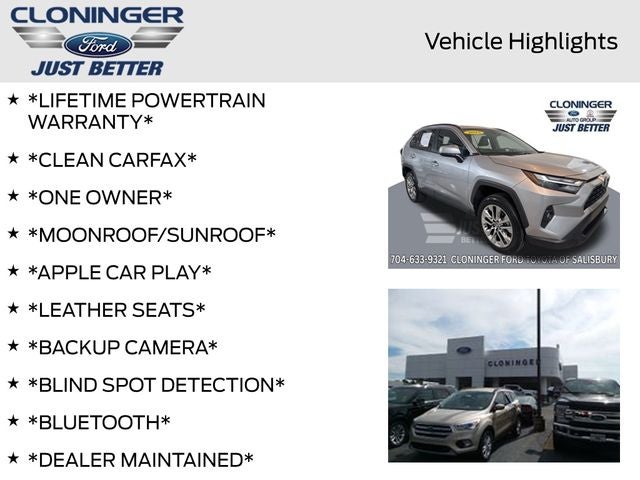 Experience exceptional value with this 2023 Toyota RAV4 XLE Premium, located in Salisbury, NC. With only 29,536 miles, this low-mileage SUV pairs Toyota reliability with upscale features and the best price in the area. Powered by a fuel-efficient 4-cylinder 2.5L gasoline engine and front-wheel drive, it delivers confident daily driving and impressive fuel economy for commuters and families alike. Step inside to premium comfort thanks to leather seats and automatic climate control that maintain an inviting cabin in any weather. Advanced safety and convenience features include Cross-Traffic Alert for added awareness while reversing, Hands Free Bluetooth® for seamless phone and audio connections, and driver-assist systems that enhance peace of mind. The CARFAX 1-Owner history underscores careful ownership and strong maintenance records, further supporting your confidence in this vehicle. This XLE Premium trim blends style and practicality with refined interior materials, user-friendly technology, and versatile cargo space—ideal for road trips, errands, and weekend adventures. Whether you're upgrading to a more refined compact SUV or seeking a dependable second vehicle, this Toyota RAV4 represents smart value. Located in Salisbury, NC, and priced to sell fast, this Toyota RAV4 offers the best price and exceptional low-mileage condition. Schedule a viewing or test drive today and experience why the 2023 Toyota RAV4 XLE Premium stands out as a top choice in its class.