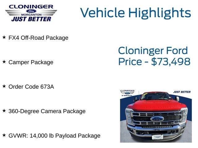 360-Degree Camera Package (360-Degree Camera System, BLIS w/Cross-Traffic Alert, LED Center High-Mounted Stop Lamp (CHMSL) Camera, and Rear Parking Sensors), Camper Package (Rear Stabilizer Bar), FX4 Off-Road Package (Hill Descent Control, Off-Road Specifically Tuned Shock Absorbers, and Unique FX4 Off-Road Box Decal), GVWR: 14,000 lb Payload Package, Order Code 673A, 4WD, Limited Slip w/4.30 Axle Ratio, 19.5 Forged Polished Aluminum Wheels, 4 Speakers, 4-Wheel Disc Brakes, 410 Amp Dual Alternators, ABS brakes, Air Conditioning, Alloy wheels, AM/FM radio, AM/FM Stereo w/MP3 Player, Auto High-beam Headlights, Brake assist, Bumpers: chrome, Cloth 40/20/40 Split Bench Seat, Compass, Defrost w/Fixed & Privacy Glass, Delay-off headlights, Driver door bin, Driver vanity mirror, Dual front impact airbags, Dual front side impact airbags, Dual rear wheels, Electronic Stability Control, Emergency communication system: SYNC 4 911 Assist, Engine Block Heater, Exterior Backup Alarm (Pre-Installed), Exterior Parking Camera Rear, Front anti-roll bar, Front Center Armrest w/Storage, Front fog lights, Front License Plate Bracket, Front reading lights, Front Wheel Well Liners (Pre-Installed), Fully automatic headlights, Gooseneck Dual Hitch Kit (Pre-Installed), Heated door mirrors, Illuminated entry, LED Box Lighting, Outside temperature display, Overhead airbag, Overhead console, Panic alarm, Passenger cancellable airbag, Passenger door bin, Passenger vanity mirror, Platform Running Boards, Power door mirrors, Power driver seat, Power steering, Power windows, PowerScope Trailer Tow Mirrors w/Heat, Rapid-Heat Supplemental Cab Heater, Rear anti-roll bar, Rear step bumper, Remote keyless entry, Remote Start System, Speed control, Steering wheel mounted audio controls, SYNC 4, Tachometer, Telescoping steering wheel, Tilt steering wheel, Tough Bed Spray-In Bedliner, Traction control, Trip computer, Turn signal indicator mirrors, Upfitter Switches (6), and Variably intermittent wipers.
