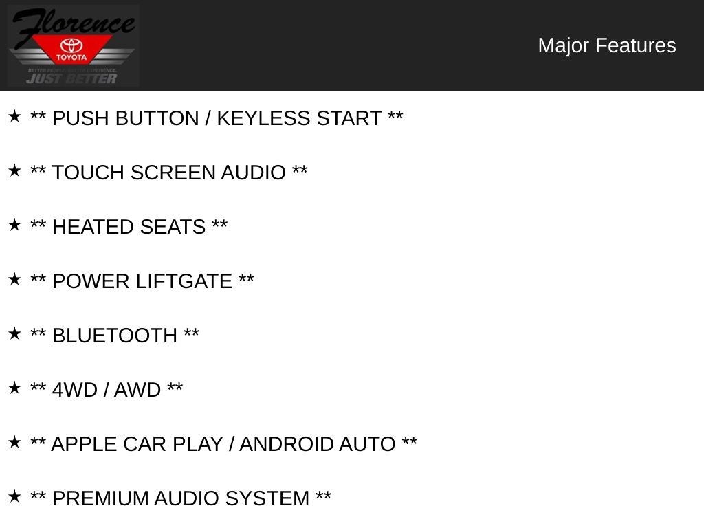 At Florence Toyota come see how our USED CARS are JUST BETTER. We offer the following benefits: Lifetime Power Train (Some exclusions apply), 1st Year Maintenance, $500 Additional Trade In Appraisal, 72 Hour Vehicle Exchange Program, Yearly Vehicle Appraisal & Safety Inspection, VIP Loyalty Program, Routine Express Service, Courtesy Service Shuttle, Express Buying Service. Also, as an added benefit we will buy your vehicle even if you don't buy ours!! Call today (866)830-0793 or visit us at www.florencetoyota.com *Customer must trade-in a vehicle to receive $1,000 Trade Assist credit that is included in the online price. **Financing must be provided by a third-party lender using this dealership's assistance for Customer to receive $1,000 Financing Assist credit that is included in the online price. See dealer for complete details.