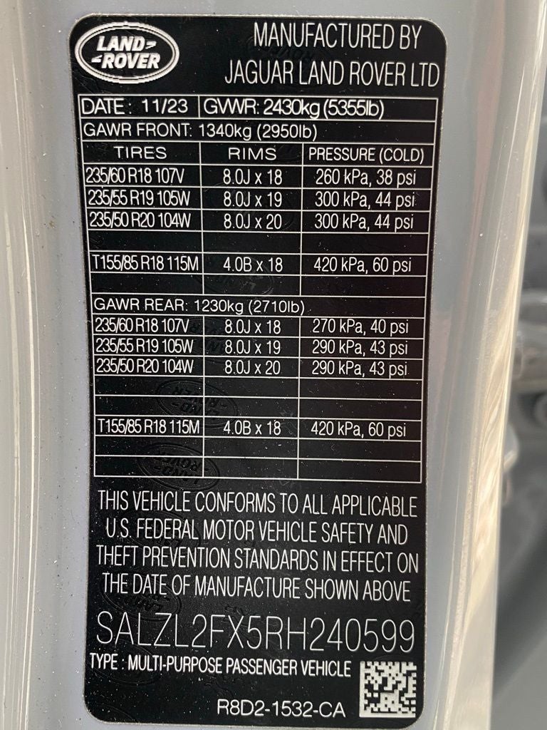 Powered by a 2.0L Turbocharged engine and paired with a 9-Speed Automatic transmission, this Range Rover Evoque Dynamic delivers an impressive blend of performance and efficiency, with an EPA-estimated 20 MPG in the city and 27 MPG on the highway.